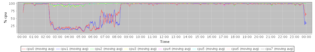 avg(cpu0) = 5.24 avg(cpu1) = 4.65 avg(cpu2) = 0.65 avg(cpu3) = 0.48 avg(cpu4) = 0.46 avg(cpu5) = 0.28 avg(cpu6) = 0.15 avg(cpu7) = 0.14