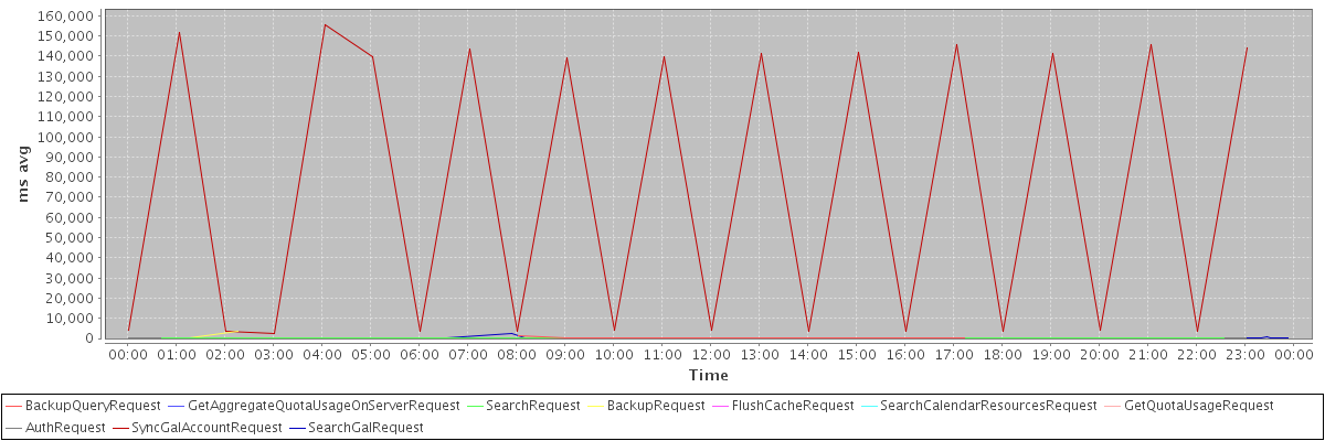 avg(BackupQueryRequest) = 360.60 avg(GetAggregateQuotaUsageOnServerRequest) = 1199.00 avg(SearchRequest) = 10.55 avg(BackupRequest) = 1852.50 avg(FlushCacheRequest) = 6.00 avg(SearchCalendarResourcesRequest) = 49.00 avg(GetQuotaUsageRequest) = 2389.00 avg(AuthRequest) = 10.00 avg(SyncGalAccountRequest) = 73911.96 avg(SearchGalRequest) = 52.18