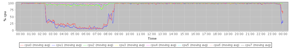 avg(cpu0) = 7.51 avg(cpu1) = 7.49 avg(cpu2) = 0.82 avg(cpu3) = 0.73 avg(cpu4) = 0.46 avg(cpu5) = 0.41 avg(cpu6) = 0.29 avg(cpu7) = 0.21