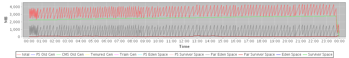 avg(total) = 3365.26 avg(PS Old Gen) = 0.00 avg(CMS Old Gen) = 2509.33 avg(Tenured Gen) = 0.00 avg(Train Gen) = 0.00 avg(PS Eden Space) = 0.00 avg(PS Survivor Space) = 0.00 avg(Par Eden Space) = 800.53 avg(Par Survivor Space) = 55.40 avg(Eden Space) = 0.00 avg(Survivor Space) = 0.00