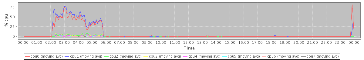 avg(cpu0) = 5.09 avg(cpu1) = 5.01 avg(cpu2) = 0.62 avg(cpu3) = 0.59 avg(cpu4) = 0.38 avg(cpu5) = 0.35 avg(cpu6) = 0.18 avg(cpu7) = 0.31