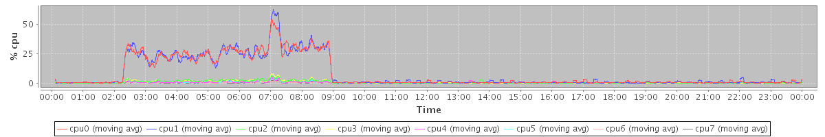 avg(cpu0) = 13.71 avg(cpu1) = 13.26 avg(cpu2) = 0.69 avg(cpu3) = 0.74 avg(cpu4) = 0.27 avg(cpu5) = 0.28 avg(cpu6) = 0.09 avg(cpu7) = 0.09