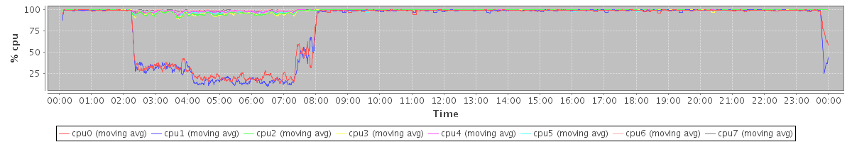 avg(cpu0) = 10.75 avg(cpu1) = 11.81 avg(cpu2) = 0.50 avg(cpu3) = 0.52 avg(cpu4) = 0.24 avg(cpu5) = 0.24 avg(cpu6) = 0.06 avg(cpu7) = 0.07