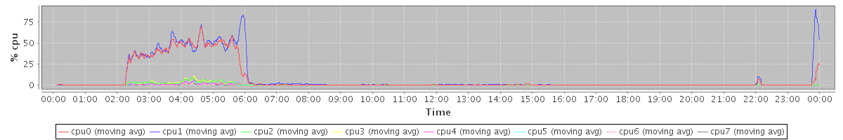 avg(cpu0) = 7.09 avg(cpu1) = 8.65 avg(cpu2) = 0.51 avg(cpu3) = 0.55 avg(cpu4) = 0.26 avg(cpu5) = 0.26 avg(cpu6) = 0.12 avg(cpu7) = 0.08