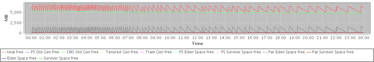 avg(total free) = 5889.23 avg(PS Old Gen free) = 0.00 avg(CMS Old Gen free) = 4980.96 avg(Tenured Gen free) = 0.00 avg(Train Gen free) = 0.00 avg(PS Eden Space free) = 0.00 avg(PS Survivor Space free) = 0.00 avg(Par Eden Space free) = 788.35 avg(Par Survivor Space free) = 119.93 avg(Eden Space free) = 0.00 avg(Survivor Space free) = 0.00