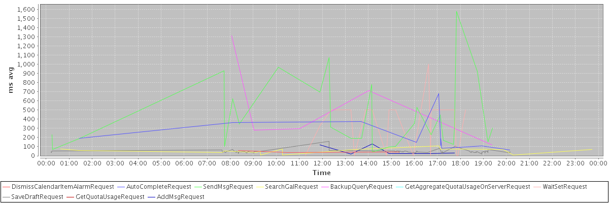 avg(DismissCalendarItemAlarmRequest) = 44.00 avg(AutoCompleteRequest) = 231.80 avg(SendMsgRequest) = 430.64 avg(SearchGalRequest) = 54.88 avg(BackupQueryRequest) = 544.80 avg(GetAggregateQuotaUsageOnServerRequest) = 807.00 avg(WaitSetRequest) = 71.76 avg(SaveDraftRequest) = 46.22 avg(GetQuotaUsageRequest) = 918.00 avg(AddMsgRequest) = 53.57