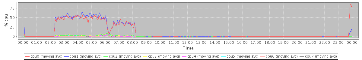 avg(cpu0) = 11.52 avg(cpu1) = 11.62 avg(cpu2) = 0.63 avg(cpu3) = 0.68 avg(cpu4) = 0.26 avg(cpu5) = 0.29 avg(cpu6) = 0.09 avg(cpu7) = 0.13