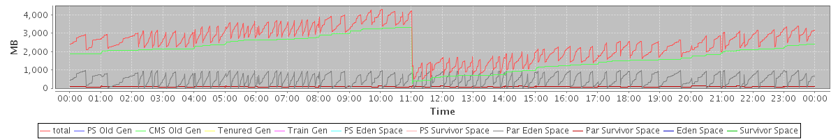 avg(total free) = 2202.25 avg(PS Old Gen free) = 0.00 avg(CMS Old Gen free) = 1699.14 avg(Tenured Gen free) = 0.00 avg(Train Gen free) = 0.00 avg(PS Eden Space free) = 0.00 avg(PS Survivor Space free) = 0.00 avg(Par Eden Space free) = 469.65 avg(Par Survivor Space free) = 33.46 avg(Eden Space free) = 0.00 avg(Survivor Space free) = 0.00