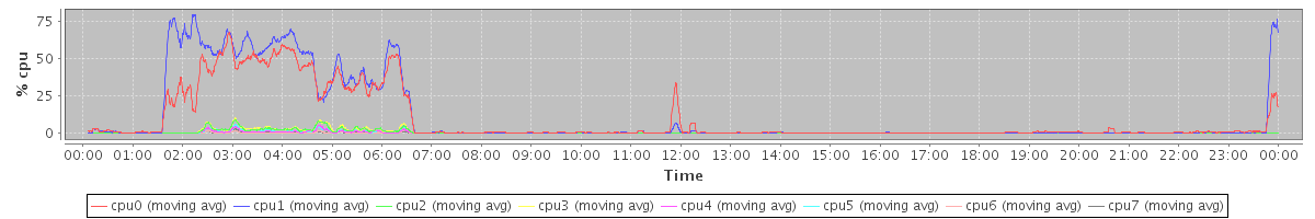 avg(cpu0) = 5.74 avg(cpu1) = 6.09 avg(cpu2) = 0.88 avg(cpu3) = 0.73 avg(cpu4) = 0.51 avg(cpu5) = 0.41 avg(cpu6) = 0.20 avg(cpu7) = 0.23