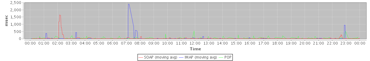avg(BackupQueryRequest) = 278.00 avg(GetAggregateQuotaUsageOnServerRequest) = 1568.00 avg(FolderActionRequest.empty) = 165.50 avg(FolderActionRequest.grant) = 219.00 avg(SendInviteReplyRequest) = 751.00 avg(AutoCompleteRequest) = 227.25 avg(BackupRequest) = 1537.00 avg(SendMsgRequest) = 664.14 avg(SaveDraftRequest) = 187.03 avg(GetQuotaUsageRequest) = 1053.00
