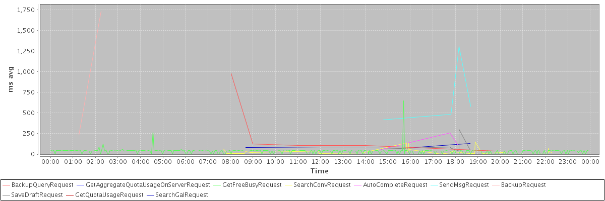 avg(BackupQueryRequest) = 271.40 avg(GetAggregateQuotaUsageOnServerRequest) = 966.00 avg(GetFreeBusyRequest) = 37.07 avg(SearchConvRequest) = 39.84 avg(AutoCompleteRequest) = 144.00 avg(SendMsgRequest) = 697.50 avg(BackupRequest) = 985.00 avg(SaveDraftRequest) = 89.30 avg(GetQuotaUsageRequest) = 1125.00 avg(SearchGalRequest) = 91.50