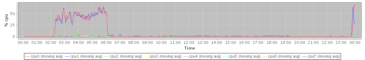 avg(cpu0) = 5.62 avg(cpu1) = 5.51 avg(cpu2) = 0.62 avg(cpu3) = 0.61 avg(cpu4) = 0.32 avg(cpu5) = 0.61 avg(cpu6) = 0.20 avg(cpu7) = 0.17