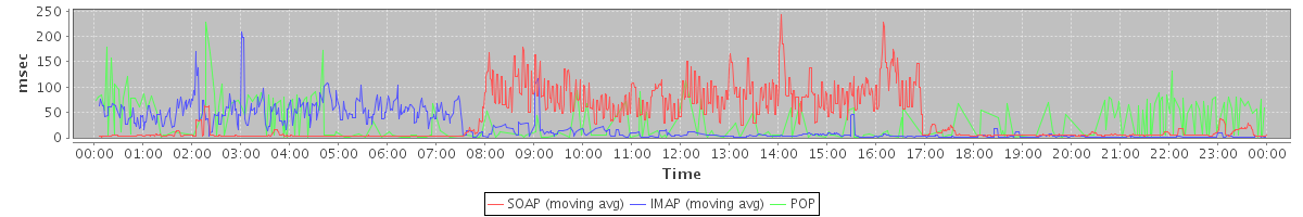 avg(AutoCompleteRequest) = 119.50 avg(SendMsgRequest) = 552.55 avg(BackupQueryRequest) = 362.60 avg(GetAggregateQuotaUsageOnServerRequest) = 1122.00 avg(GetFreeBusyRequest) = 189.67 avg(BackupRequest) = 708.00 avg(WaitSetRequest) = 126.98 avg(SaveDraftRequest) = 84.06 avg(CheckSpellingRequest) = 68.33 avg(GetQuotaUsageRequest) = 1118.00