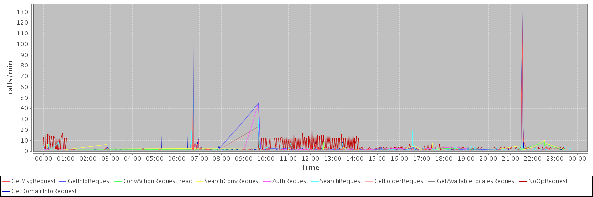 max(GetMsgRequest) = 127.00 max(GetInfoRequest) = 45.00 max(ConvActionRequest.read) = 8.00 max(SearchConvRequest) = 10.00 max(AuthRequest) = 45.00 max(SearchRequest) = 57.00 max(GetFolderRequest) = 22.00 max(GetAvailableLocalesRequest) = 23.00 max(NoOpRequest) = 19.00 max(GetDomainInfoRequest) = 131.00