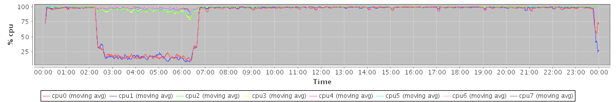 avg(cpu0) = 6.33 avg(cpu1) = 6.04 avg(cpu2) = 0.81 avg(cpu3) = 0.75 avg(cpu4) = 0.66 avg(cpu5) = 0.40 avg(cpu6) = 0.24 avg(cpu7) = 0.23