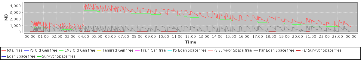 avg(total free) = 2255.30 avg(PS Old Gen free) = 0.00 avg(CMS Old Gen free) = 1752.07 avg(Tenured Gen free) = 0.00 avg(Train Gen free) = 0.00 avg(PS Eden Space free) = 0.00 avg(PS Survivor Space free) = 0.00 avg(Par Eden Space free) = 468.92 avg(Par Survivor Space free) = 34.31 avg(Eden Space free) = 0.00 avg(Survivor Space free) = 0.00