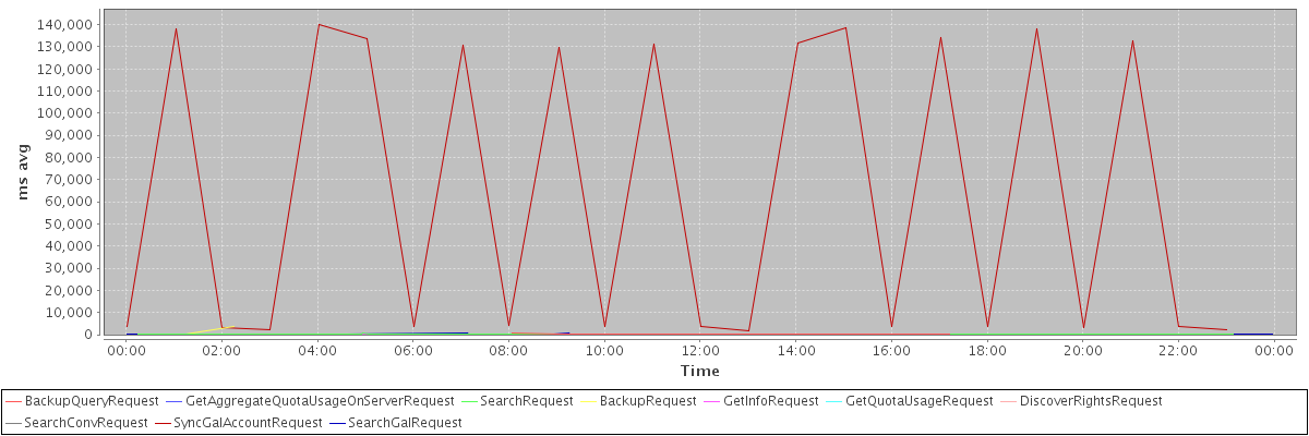 avg(BackupQueryRequest) = 269.00 avg(GetAggregateQuotaUsageOnServerRequest) = 1130.00 avg(SearchRequest) = 29.75 avg(BackupRequest) = 1859.00 avg(GetInfoRequest) = 126.33 avg(GetQuotaUsageRequest) = 1370.00 avg(DiscoverRightsRequest) = 17.33 avg(SearchConvRequest) = 38.50 avg(SyncGalAccountRequest) = 63383.42 avg(SearchGalRequest) = 43.08