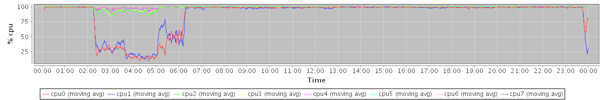 avg(cpu0) = 4.51 avg(cpu1) = 4.41 avg(cpu2) = 0.54 avg(cpu3) = 0.56 avg(cpu4) = 0.36 avg(cpu5) = 0.63 avg(cpu6) = 0.18 avg(cpu7) = 0.18