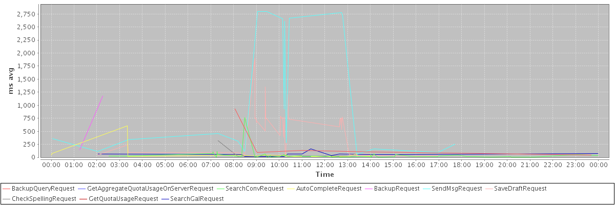 avg(BackupQueryRequest) = 258.80 avg(GetAggregateQuotaUsageOnServerRequest) = 1007.00 avg(SearchConvRequest) = 41.64 avg(AutoCompleteRequest) = 62.28 avg(BackupRequest) = 659.00 avg(SendMsgRequest) = 996.48 avg(SaveDraftRequest) = 520.24 avg(CheckSpellingRequest) = 40.13 avg(GetQuotaUsageRequest) = 1184.00 avg(SearchGalRequest) = 59.14