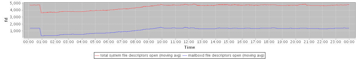 avg(total system file descriptors open) = 4456.83 avg(mailboxd file descriptors open) = 1138.53