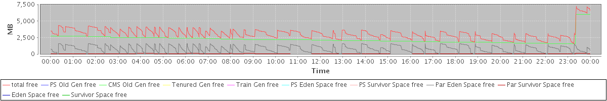 avg(total free) = 3062.57 avg(PS Old Gen free) = 0.00 avg(CMS Old Gen free) = 2230.61 avg(Tenured Gen free) = 0.00 avg(Train Gen free) = 0.00 avg(PS Eden Space free) = 0.00 avg(PS Survivor Space free) = 0.00 avg(Par Eden Space free) = 795.17 avg(Par Survivor Space free) = 36.78 avg(Eden Space free) = 0.00 avg(Survivor Space free) = 0.00