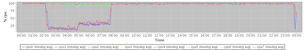avg(cpu0) = 11.59 avg(cpu1) = 12.28 avg(cpu2) = 0.46 avg(cpu3) = 0.45 avg(cpu4) = 0.21 avg(cpu5) = 0.20 avg(cpu6) = 0.05 avg(cpu7) = 0.06