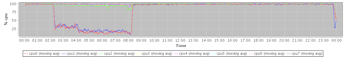 avg(cpu0) = 6.93 avg(cpu1) = 6.78 avg(cpu2) = 0.69 avg(cpu3) = 0.65 avg(cpu4) = 0.39 avg(cpu5) = 0.40 avg(cpu6) = 0.29 avg(cpu7) = 0.18