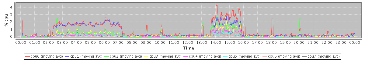 avg(cpu0) = 10.73 avg(cpu1) = 10.84 avg(cpu2) = 0.56 avg(cpu3) = 0.57 avg(cpu4) = 0.23 avg(cpu5) = 0.27 avg(cpu6) = 0.06 avg(cpu7) = 0.09