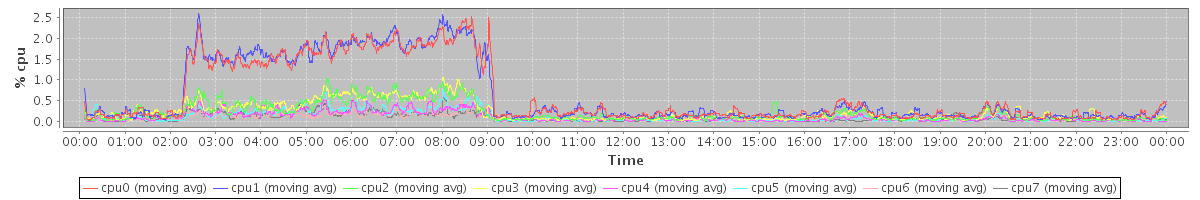 avg(cpu0) = 0.62 avg(cpu1) = 0.64 avg(cpu2) = 0.22 avg(cpu3) = 0.23 avg(cpu4) = 0.11 avg(cpu5) = 0.11 avg(cpu6) = 0.12 avg(cpu7) = 0.09