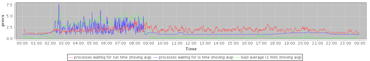avg(processes waiting for run time) = 1.34 avg(processes waiting for io time) = 0.61 avg(load average (1 min)) = 1.23
