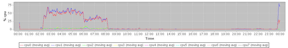 avg(cpu0) = 11.25 avg(cpu1) = 12.22 avg(cpu2) = 0.60 avg(cpu3) = 0.62 avg(cpu4) = 0.24 avg(cpu5) = 0.28 avg(cpu6) = 0.08 avg(cpu7) = 0.14