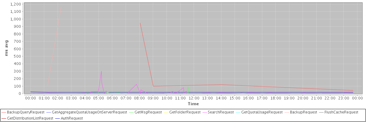 avg(BackupQueryRequest) = 263.40 avg(GetAggregateQuotaUsageOnServerRequest) = 1004.00 avg(GetMsgRequest) = 4.75 avg(GetFolderRequest) = 0.94 avg(SearchRequest) = 15.87 avg(GetQuotaUsageRequest) = 1092.00 avg(BackupRequest) = 640.50 avg(FlushCacheRequest) = 5.00 avg(GetDistributionListRequest) = 1.86 avg(AuthRequest) = 19.12