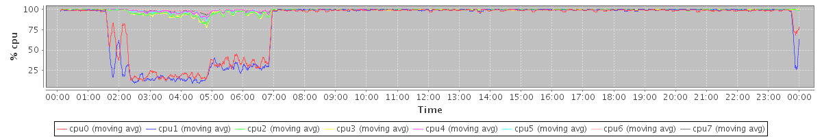 avg(cpu0) = 5.95 avg(cpu1) = 6.04 avg(cpu2) = 0.84 avg(cpu3) = 0.70 avg(cpu4) = 0.48 avg(cpu5) = 0.41 avg(cpu6) = 0.19 avg(cpu7) = 0.22