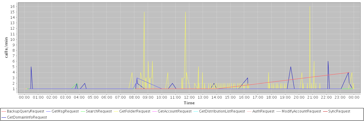 max(BackupQueryRequest) = 4.00 max(GetMsgRequest) = 3.00 max(SearchRequest) = 2.00 max(GetFolderRequest) = 16.00 max(GetAccountRequest) = 2.00 max(GetDistributionListRequest) = 1.00 max(AuthRequest) = 4.00 max(ModifyAccountRequest) = 2.00 max(SyncRequest) = 1.00 max(GetDomainInfoRequest) = 6.00
