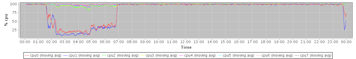 avg(cpu0) = 5.83 avg(cpu1) = 5.89 avg(cpu2) = 0.76 avg(cpu3) = 0.65 avg(cpu4) = 0.43 avg(cpu5) = 0.39 avg(cpu6) = 0.17 avg(cpu7) = 0.19