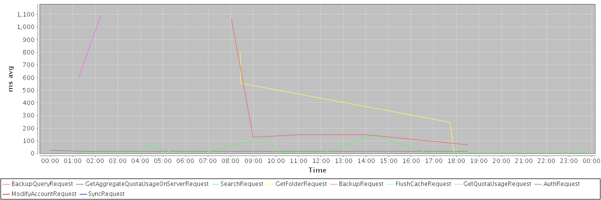 avg(BackupQueryRequest) = 310.00 avg(GetAggregateQuotaUsageOnServerRequest) = 964.00 avg(SearchRequest) = 19.82 avg(GetFolderRequest) = 203.88 avg(BackupRequest) = 849.50 avg(FlushCacheRequest) = 8.00 avg(GetQuotaUsageRequest) = 1125.00 avg(AuthRequest) = 18.75 avg(ModifyAccountRequest) = 11.00 avg(SyncRequest) = 75.00