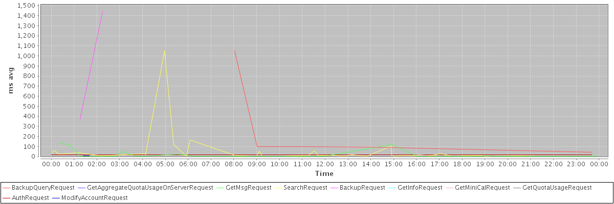 avg(BackupQueryRequest) = 278.20 avg(GetAggregateQuotaUsageOnServerRequest) = 1152.00 avg(GetMsgRequest) = 15.86 avg(SearchRequest) = 44.30 avg(BackupRequest) = 907.50 avg(GetInfoRequest) = 34.00 avg(GetMiniCalRequest) = 11.00 avg(GetQuotaUsageRequest) = 1237.00 avg(AuthRequest) = 18.75 avg(ModifyAccountRequest) = 7.25