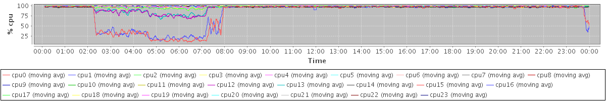 avg(cpu0) = 0.50 avg(cpu1) = 0.48 avg(cpu2) = 0.16 avg(cpu3) = 0.16 avg(cpu4) = 0.12 avg(cpu5) = 0.09 avg(cpu6) = 0.08 avg(cpu7) = 0.07 avg(cpu8) = 0.10 avg(cpu9) = 0.06 avg(cpu10) = 0.05 avg(cpu11) = 0.05 avg(cpu12) = 0.20 avg(cpu13) = 0.19 avg(cpu14) = 0.46 avg(cpu15) = 0.43 avg(cpu16) = 0.18 avg(cpu17) = 0.18 avg(cpu18) = 0.07 avg(cpu19) = 0.07 avg(cpu20) = 0.08 avg(cpu21) = 0.07 avg(cpu22) = 0.05 avg(cpu23) = 0.06