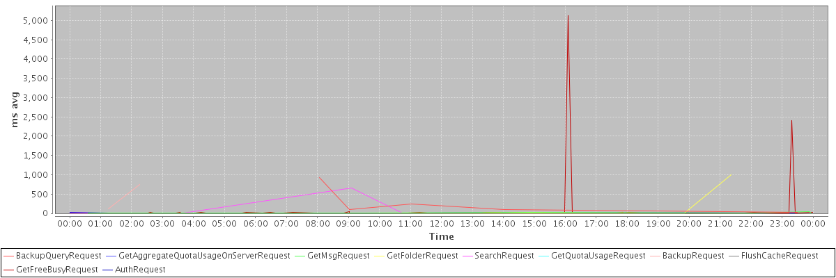 avg(BackupQueryRequest) = 280.20 avg(GetAggregateQuotaUsageOnServerRequest) = 1165.00 avg(GetMsgRequest) = 12.50 avg(GetFolderRequest) = 28.74 avg(SearchRequest) = 29.78 avg(GetQuotaUsageRequest) = 1458.00 avg(BackupRequest) = 439.50 avg(FlushCacheRequest) = 4.00 avg(GetFreeBusyRequest) = 91.66 avg(AuthRequest) = 18.38