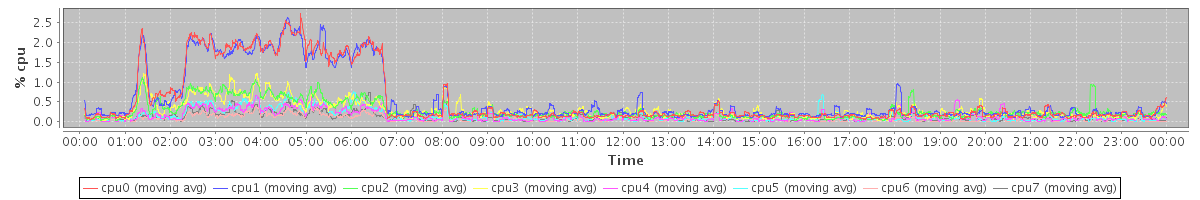 avg(cpu0) = 0.53 avg(cpu1) = 0.56 avg(cpu2) = 0.28 avg(cpu3) = 0.28 avg(cpu4) = 0.14 avg(cpu5) = 0.14 avg(cpu6) = 0.08 avg(cpu7) = 0.11
