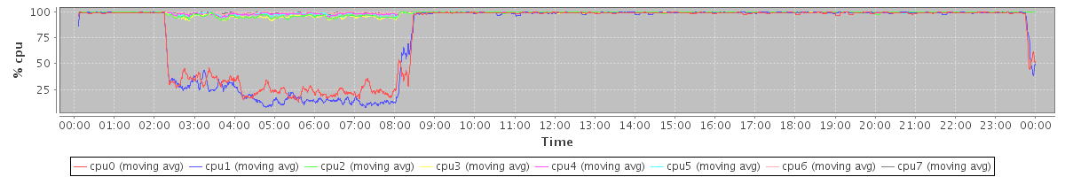 avg(cpu0) = 0.46 avg(cpu1) = 0.49 avg(cpu2) = 0.11 avg(cpu3) = 0.15 avg(cpu4) = 0.09 avg(cpu5) = 0.10 avg(cpu6) = 0.06 avg(cpu7) = 0.06