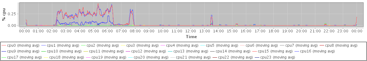 avg(cpu0) = 5.52 avg(cpu1) = 5.94 avg(cpu2) = 0.70 avg(cpu3) = 0.73 avg(cpu4) = 0.46 avg(cpu5) = 0.41 avg(cpu6) = 0.25 avg(cpu7) = 0.29 avg(cpu8) = 0.13 avg(cpu9) = 0.15 avg(cpu10) = 0.13 avg(cpu11) = 0.14 avg(cpu12) = 1.18 avg(cpu13) = 1.07 avg(cpu14) = 2.54 avg(cpu15) = 2.65 avg(cpu16) = 1.03 avg(cpu17) = 1.07 avg(cpu18) = 0.37 avg(cpu19) = 0.30 avg(cpu20) = 0.14 avg(cpu21) = 0.22 avg(cpu22) = 0.13 avg(cpu23) = 0.21