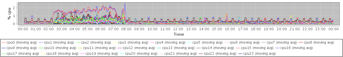 avg(cpu0) = 0.46 avg(cpu1) = 0.50 avg(cpu2) = 0.17 avg(cpu3) = 0.16 avg(cpu4) = 0.10 avg(cpu5) = 0.11 avg(cpu6) = 0.11 avg(cpu7) = 0.06 avg(cpu8) = 0.05 avg(cpu9) = 0.05 avg(cpu10) = 0.04 avg(cpu11) = 0.04 avg(cpu12) = 0.20 avg(cpu13) = 0.19 avg(cpu14) = 0.44 avg(cpu15) = 0.43 avg(cpu16) = 0.16 avg(cpu17) = 0.16 avg(cpu18) = 0.08 avg(cpu19) = 0.07 avg(cpu20) = 0.06 avg(cpu21) = 0.07 avg(cpu22) = 0.05 avg(cpu23) = 0.05