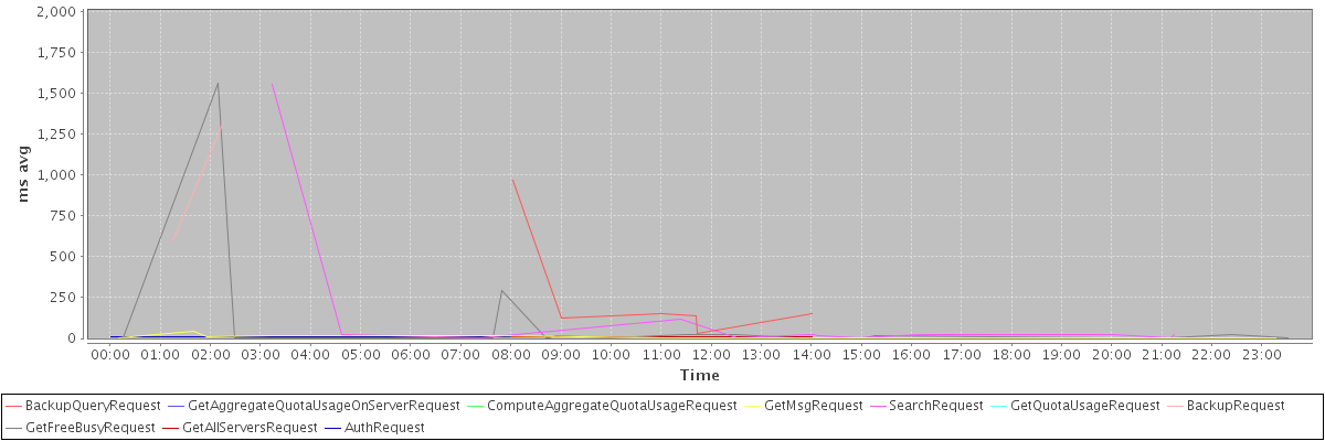 avg(BackupQueryRequest) = 261.00 avg(GetAggregateQuotaUsageOnServerRequest) = 1263.00 avg(ComputeAggregateQuotaUsageRequest) = 1923.00 avg(GetMsgRequest) = 6.83 avg(SearchRequest) = 141.62 avg(GetQuotaUsageRequest) = 1293.00 avg(BackupRequest) = 962.00 avg(GetFreeBusyRequest) = 90.73 avg(GetAllServersRequest) = 9.20 avg(AuthRequest) = 10.45