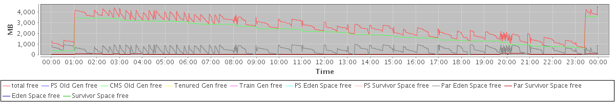 avg(total free) = 2575.12 avg(PS Old Gen free) = 0.00 avg(CMS Old Gen free) = 2079.10 avg(Tenured Gen free) = 0.00 avg(Train Gen free) = 0.00 avg(PS Eden Space free) = 0.00 avg(PS Survivor Space free) = 0.00 avg(Par Eden Space free) = 468.20 avg(Par Survivor Space free) = 27.83 avg(Eden Space free) = 0.00 avg(Survivor Space free) = 0.00