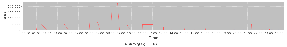 avg(BackupQueryRequest) = 280.40 avg(GetAggregateQuotaUsageOnServerRequest) = 939.00 avg(AutoCompleteRequest) = 1342.00 avg(SearchRequest) = 124.89 avg(BackupRequest) = 1734.00 avg(GetMiniCalRequest) = 260.00 avg(GetQuotaUsageRequest) = 1294.00 avg(SearchConvRequest) = 407.00 avg(AuthRequest) = 72.71 avg(SyncGalAccountRequest) = 92520.83