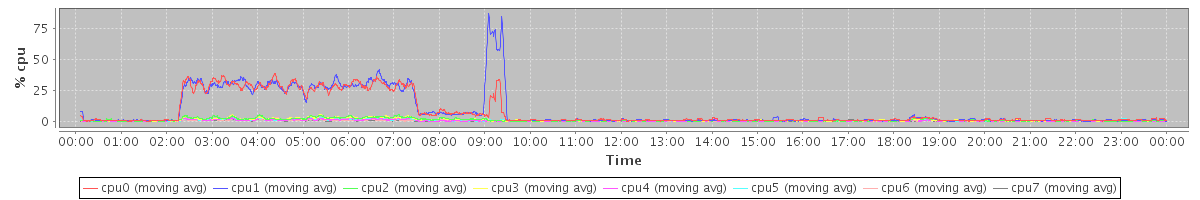 avg(cpu0) = 7.90 avg(cpu1) = 8.85 avg(cpu2) = 1.31 avg(cpu3) = 1.27 avg(cpu4) = 0.60 avg(cpu5) = 0.65 avg(cpu6) = 0.50 avg(cpu7) = 0.35