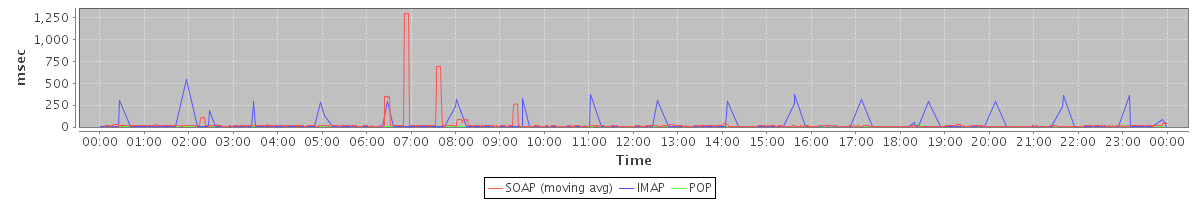 avg(BackupQueryRequest) = 332.40 avg(GetAggregateQuotaUsageOnServerRequest) = 1171.00 avg(GetMsgRequest) = 23.50 avg(SearchRequest) = 124.00 avg(BackupRequest) = 810.00 avg(FlushCacheRequest) = 4.00 avg(GetFreeBusyRequest) = 220.85 avg(GetQuotaUsageRequest) = 1378.00 avg(AuthRequest) = 163.00 avg(ModifyAccountRequest) = 7.04