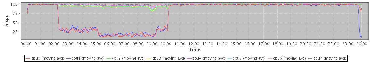 avg(cpu0) = 10.54 avg(cpu1) = 10.73 avg(cpu2) = 1.48 avg(cpu3) = 1.47 avg(cpu4) = 0.75 avg(cpu5) = 0.75 avg(cpu6) = 0.62 avg(cpu7) = 0.46