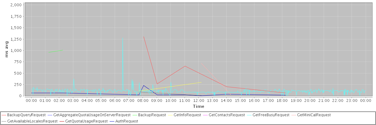 avg(BackupQueryRequest) = 497.00 avg(GetAggregateQuotaUsageOnServerRequest) = 1312.00 avg(BackupRequest) = 984.50 avg(GetInfoRequest) = 201.50 avg(GetContactsRequest) = 65.00 avg(GetFreeBusyRequest) = 105.16 avg(GetMiniCalRequest) = 373.00 avg(GetAvailableLocalesRequest) = 47.50 avg(GetQuotaUsageRequest) = 1957.00 avg(AuthRequest) = 55.50